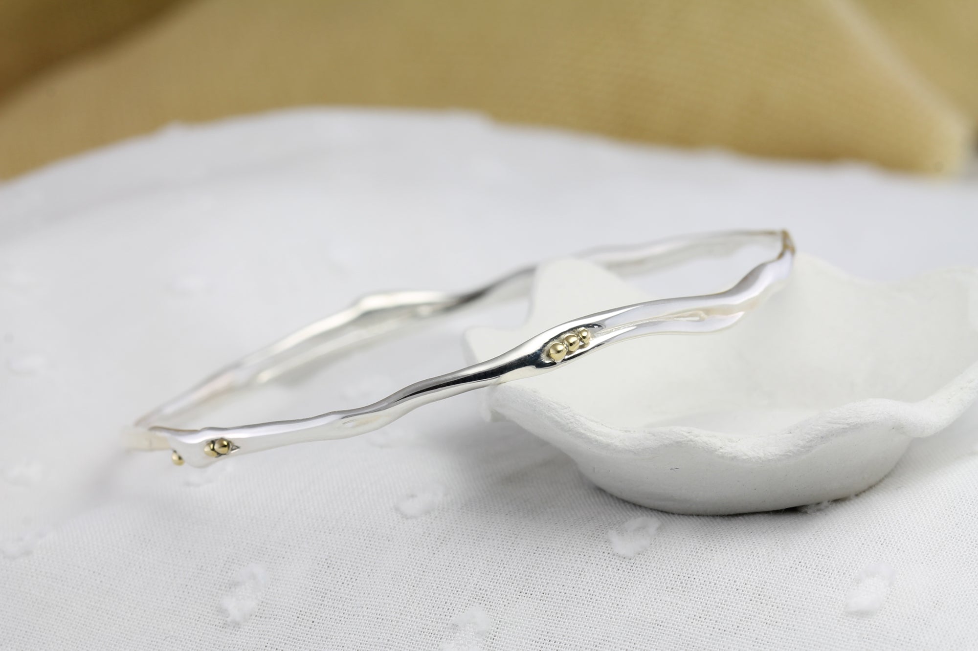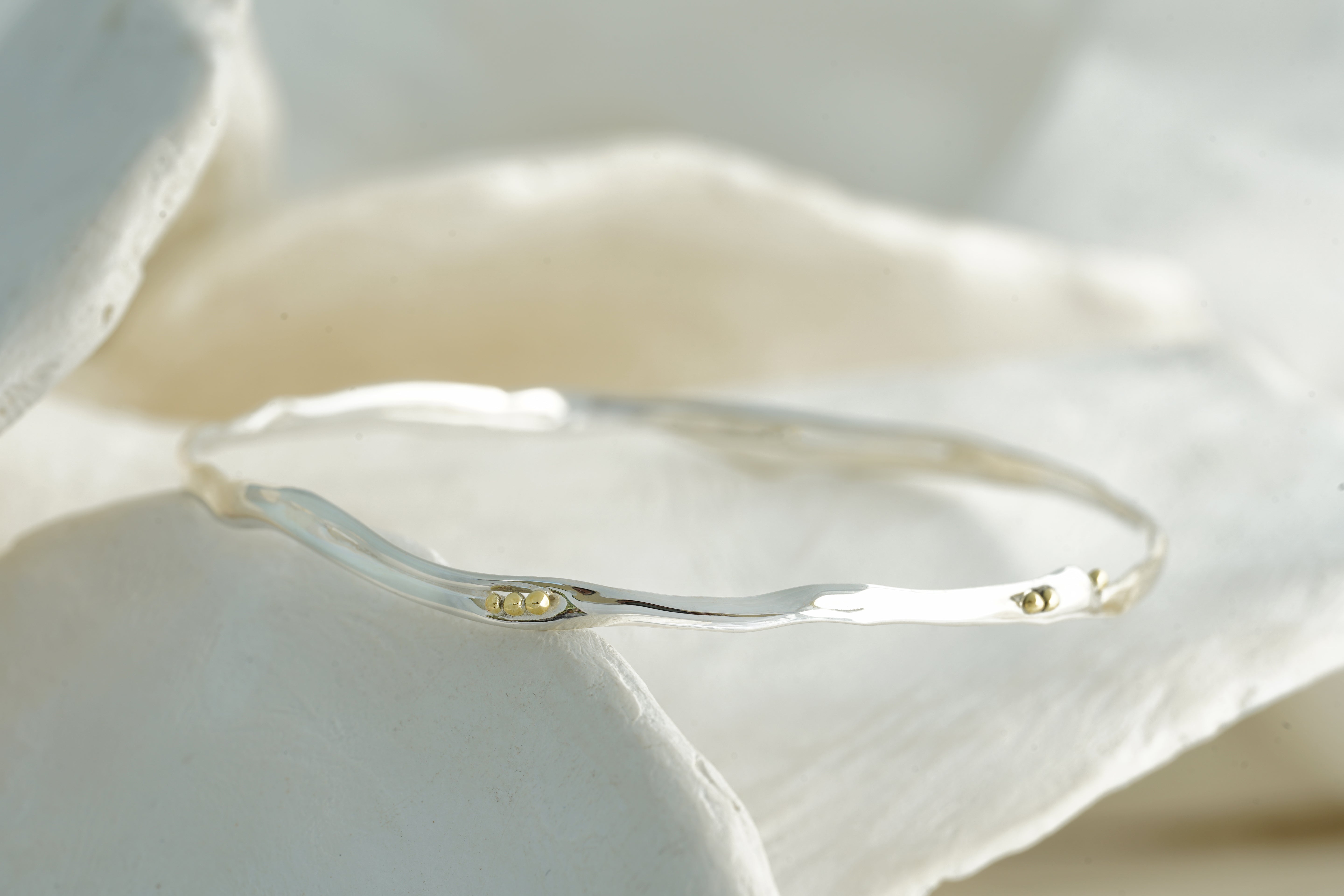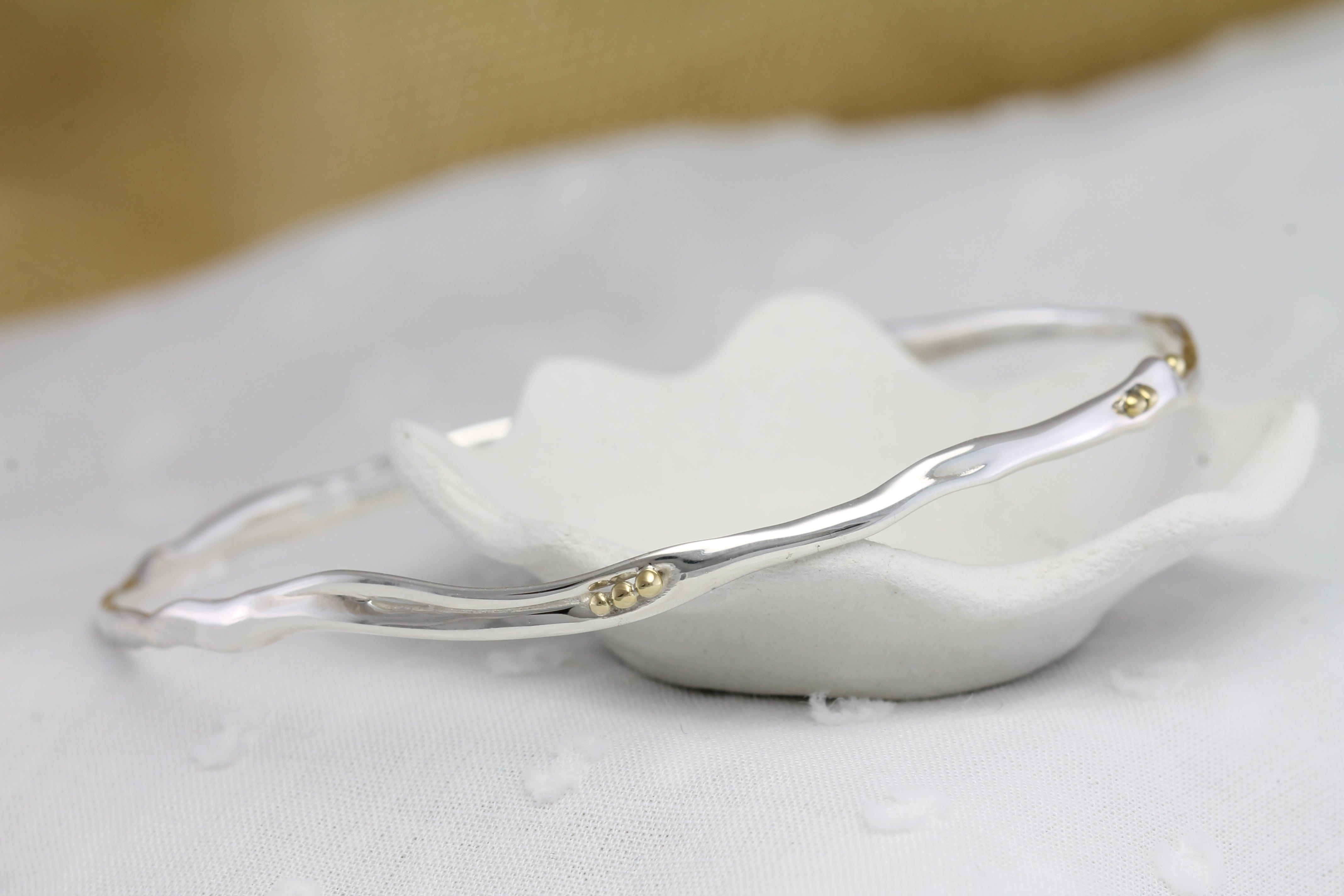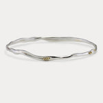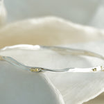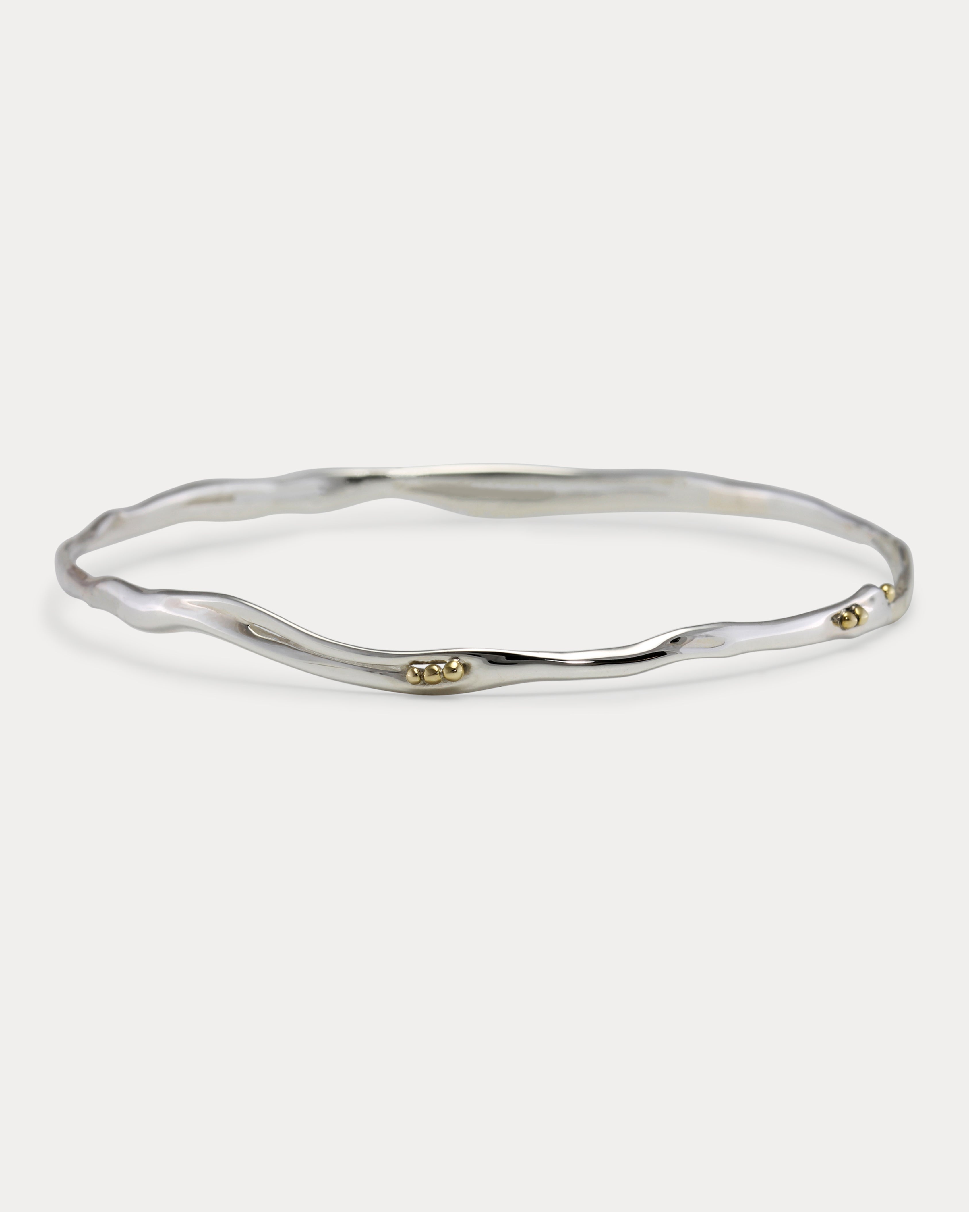 This handcrafted Sterling Silver bangle has a dainty, flowing form, adorned with clusters of brass pips.