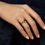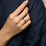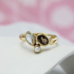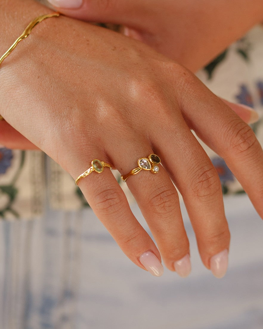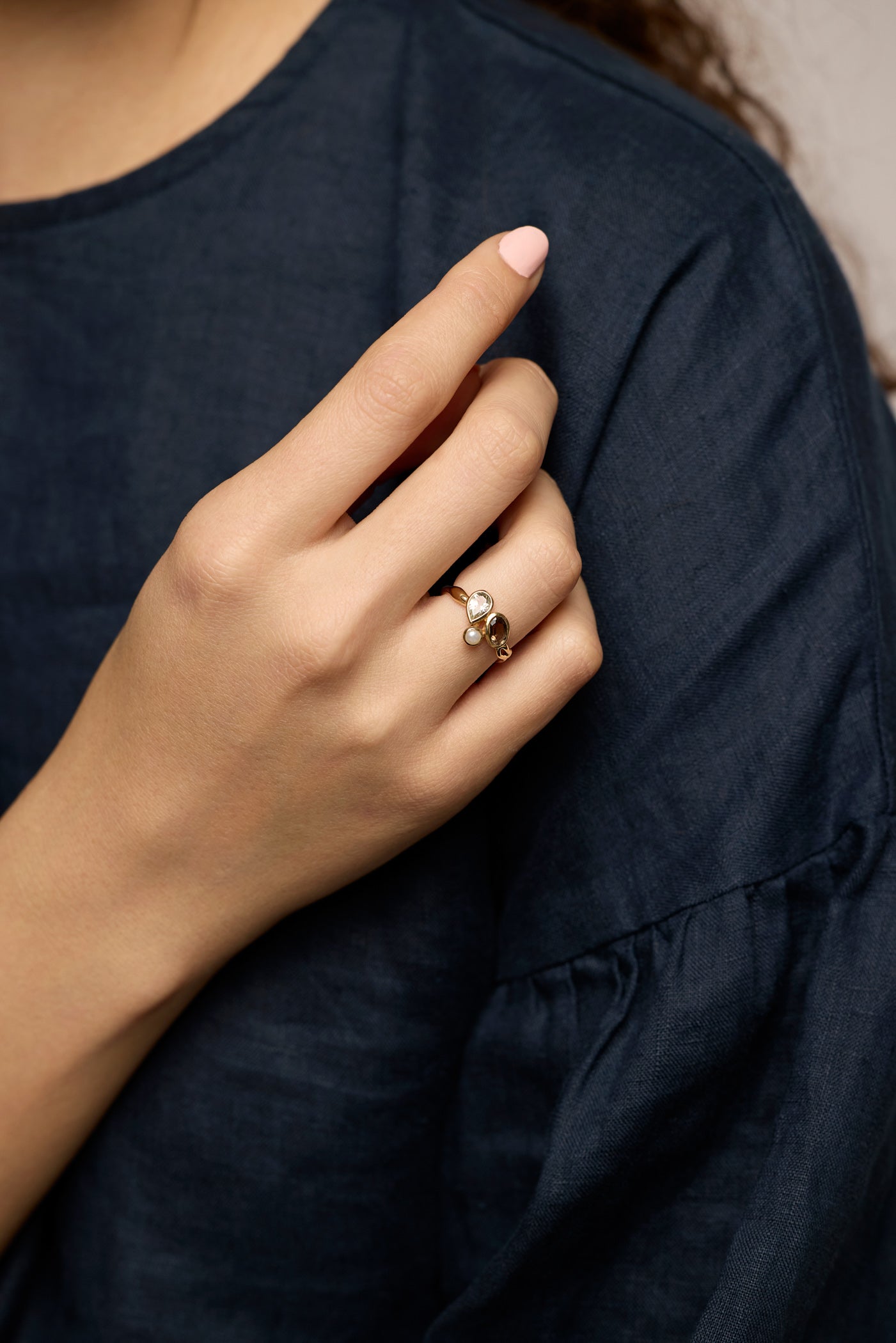 This multi stone ring is crafted with flowing strands of 18KT Gold Vermeil, creating a band full of character. A Green Amethyst and a Smoky Quartz sit in the centre, paired with a Freshwater Pearl creating beautiful harmony. With an organically sculptural design, this cluster ring makes a beautiful statement whilst remaining effortlessly wearable.