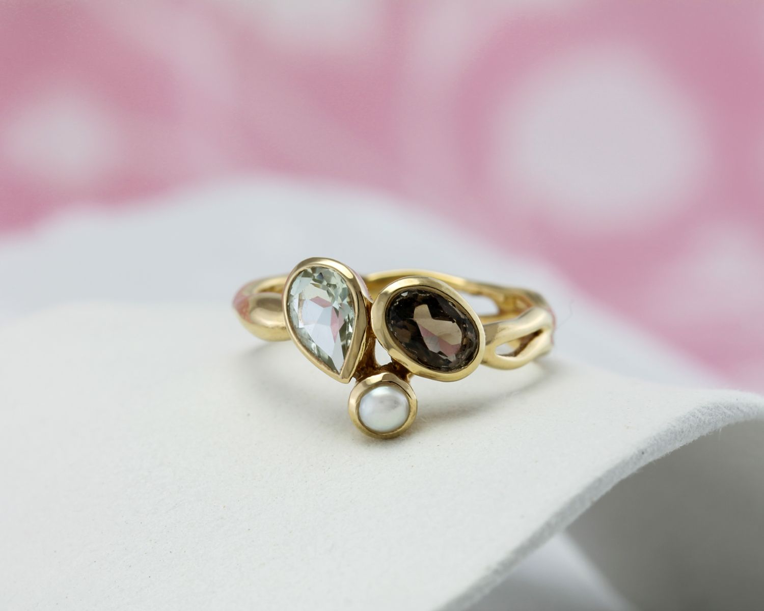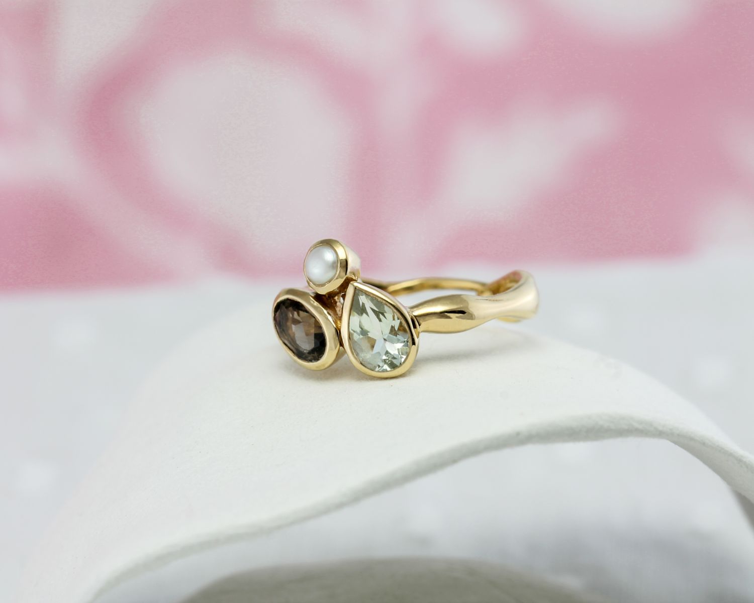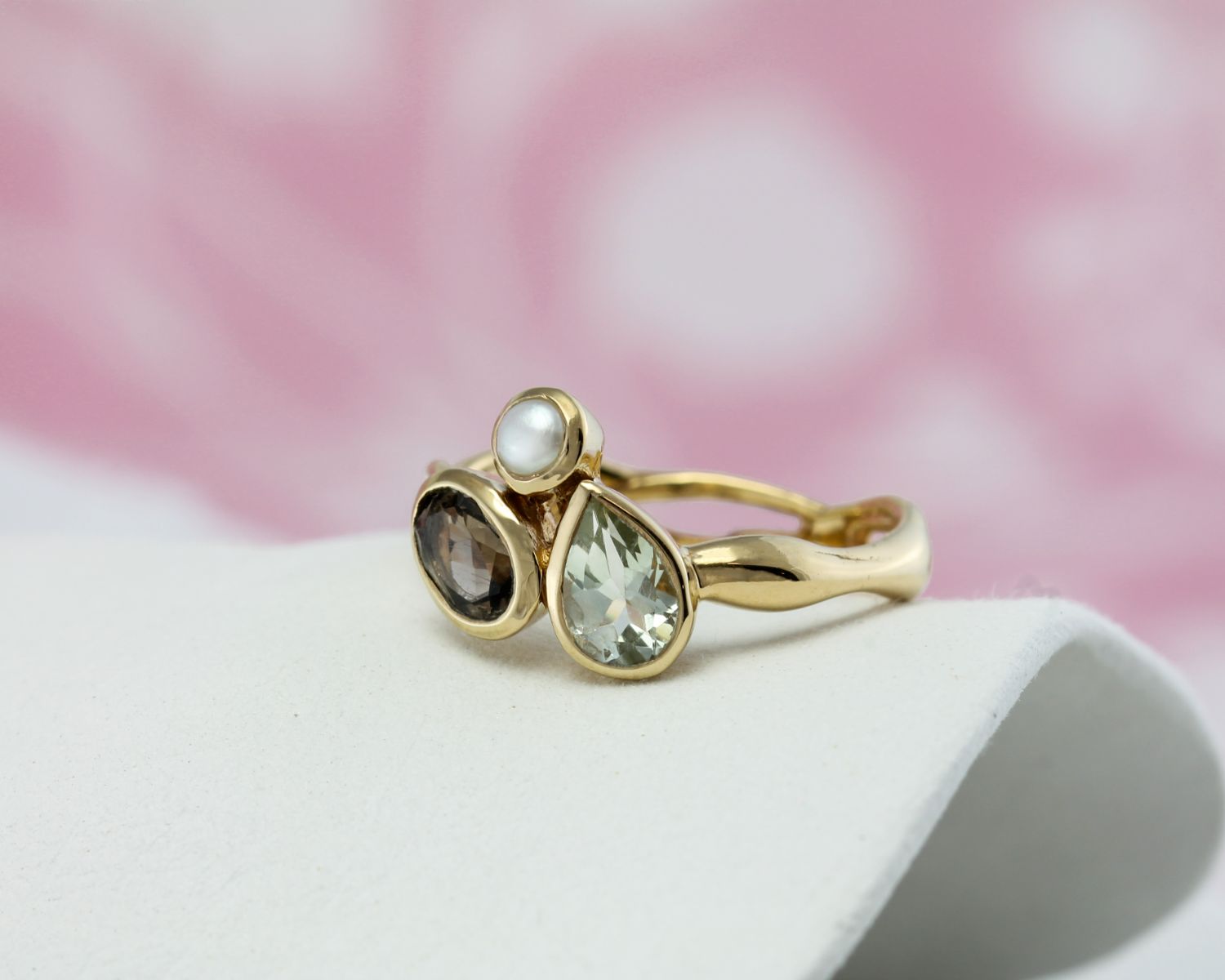 Smoky Quartz, Green Amethyst and Pearl Gold Ring
