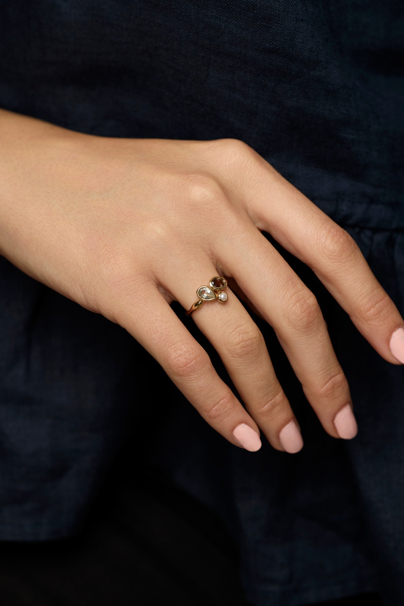 Handcrafted in 18KT Gold Vermeil, this ring is set with a Green Amethyst, a Smoky Quartz and a Freshwater Pearl.