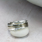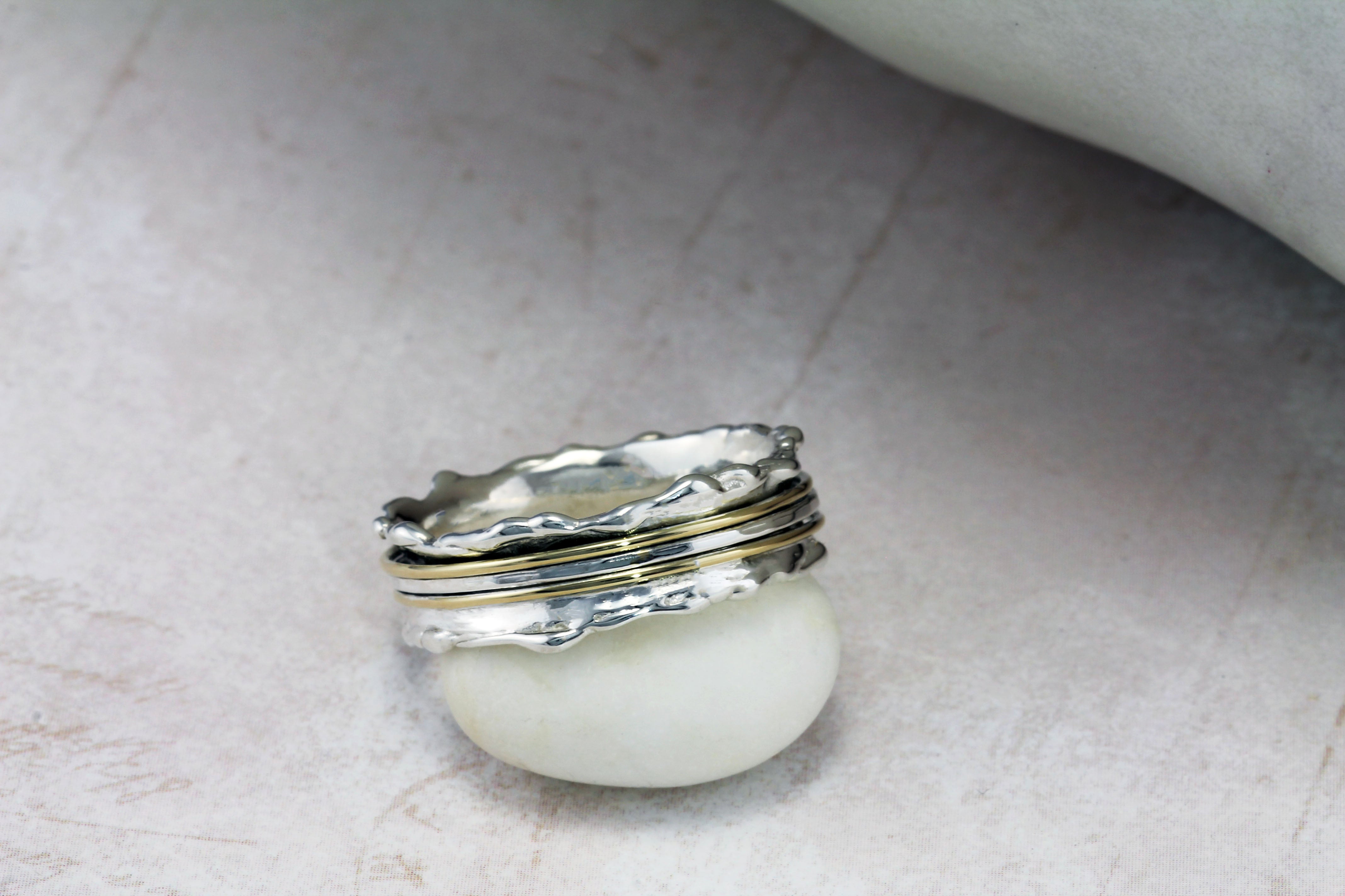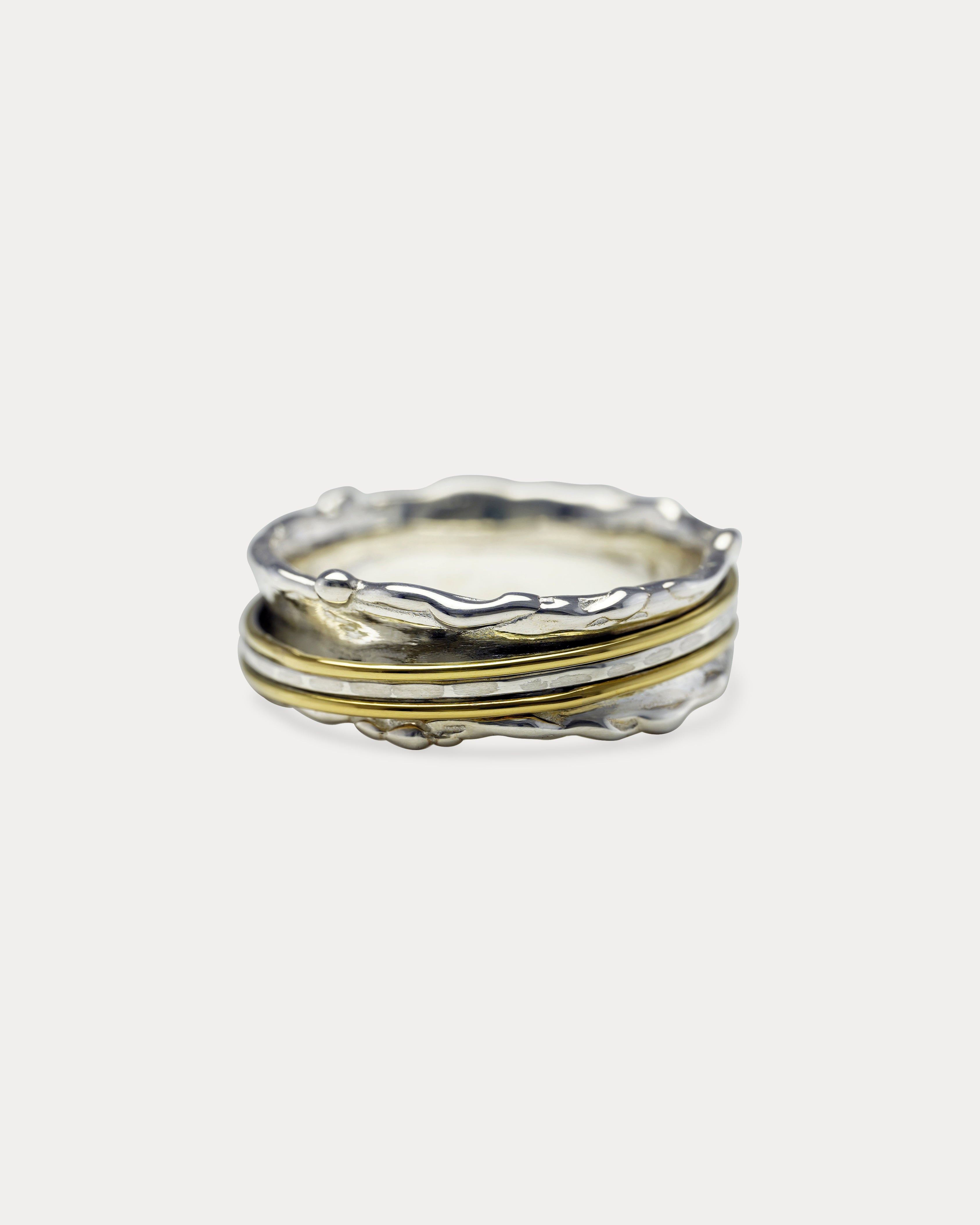 This elegant, minimal design features a smooth Sterling Silver band adorned with three delicate spinning rings; two radiant brass spinners and one in silver. The gentle movement of the bands offers a calming, tactile experience, making it a soothing piece to wear throughout the day.