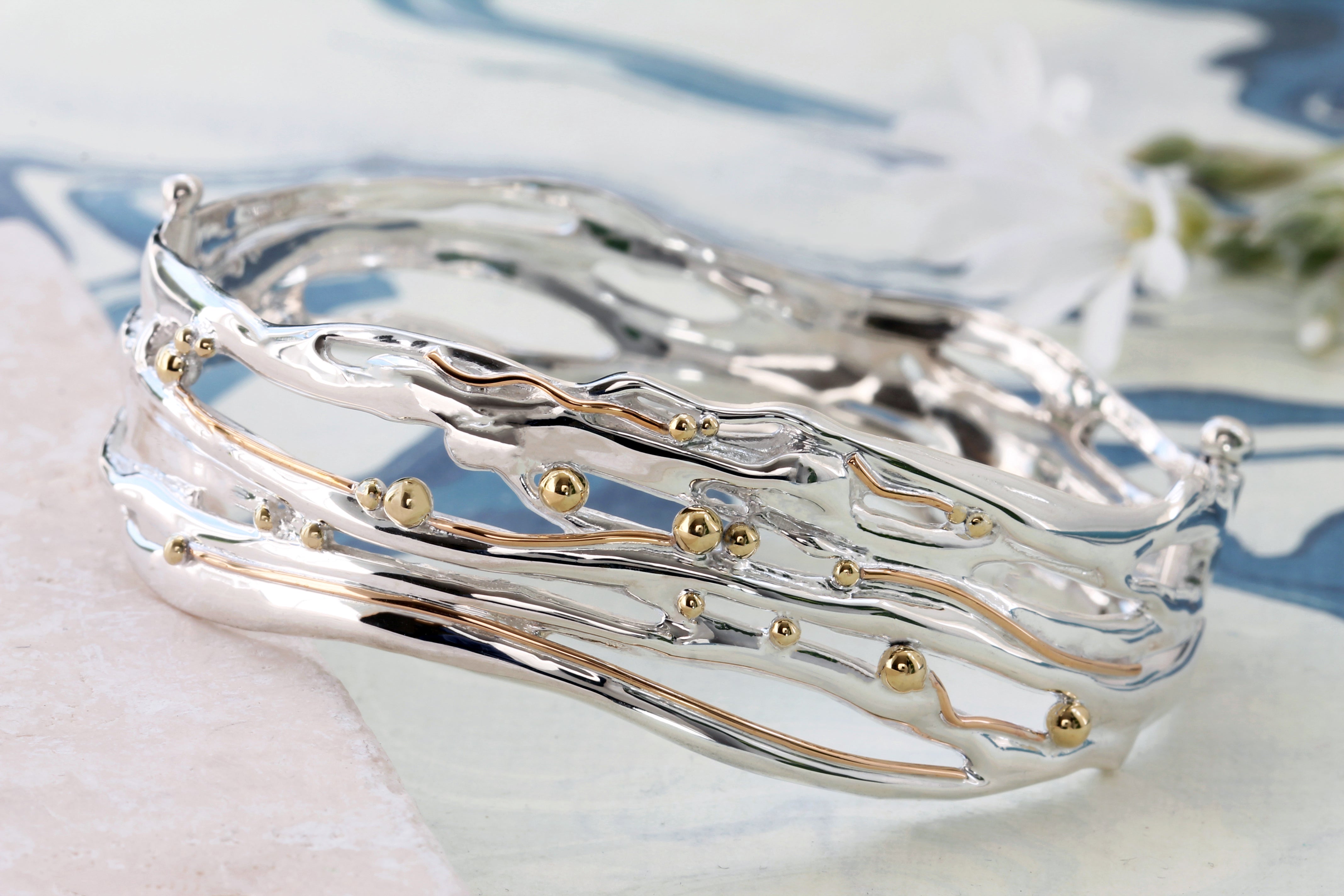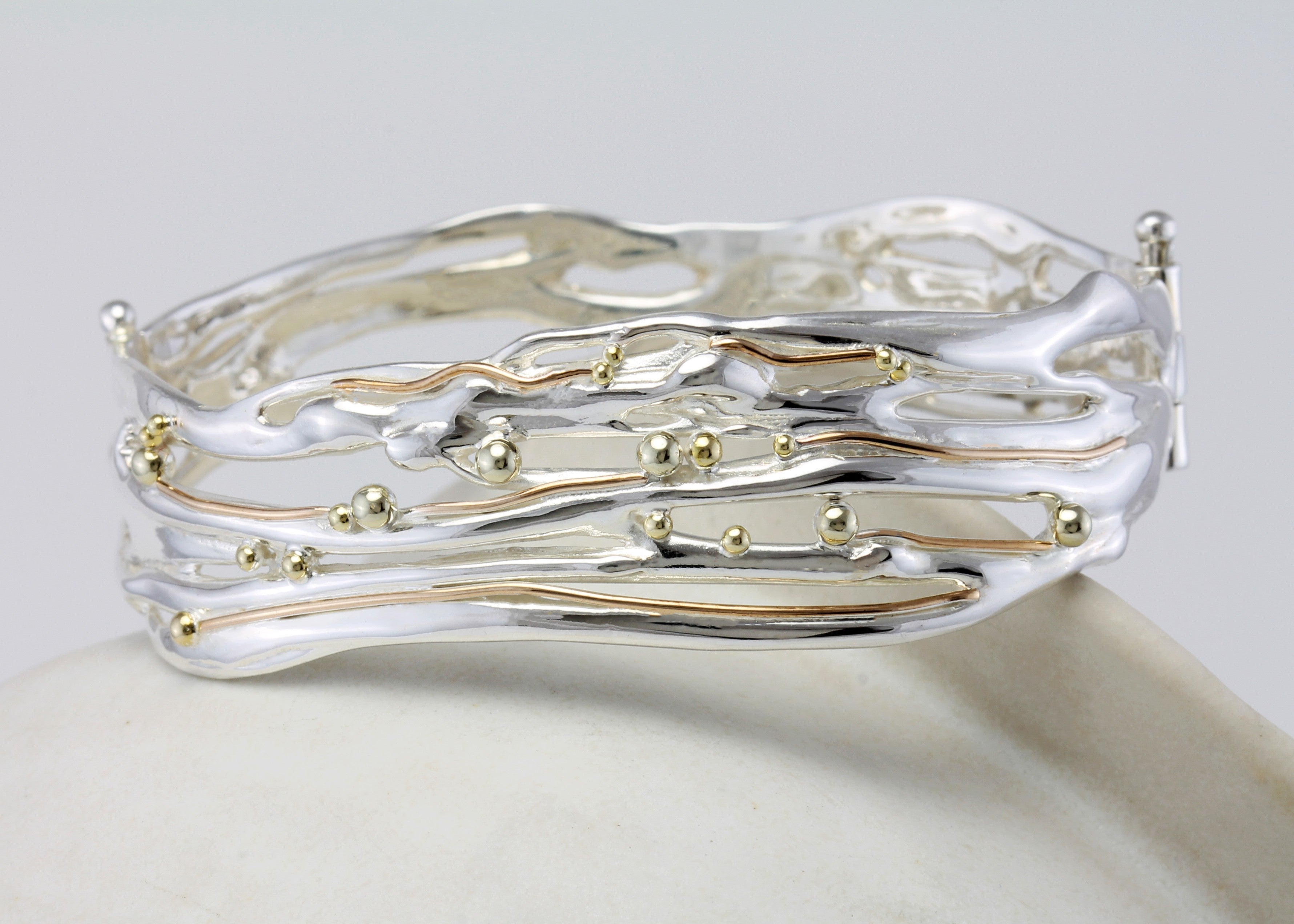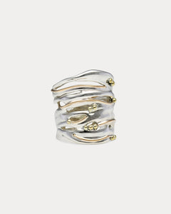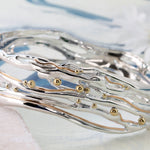 This organic Sterling Silver bangle features flowing curves, 14KT Gold details and is scattered with dainty Brass pips. The perfect intricate statement piece.