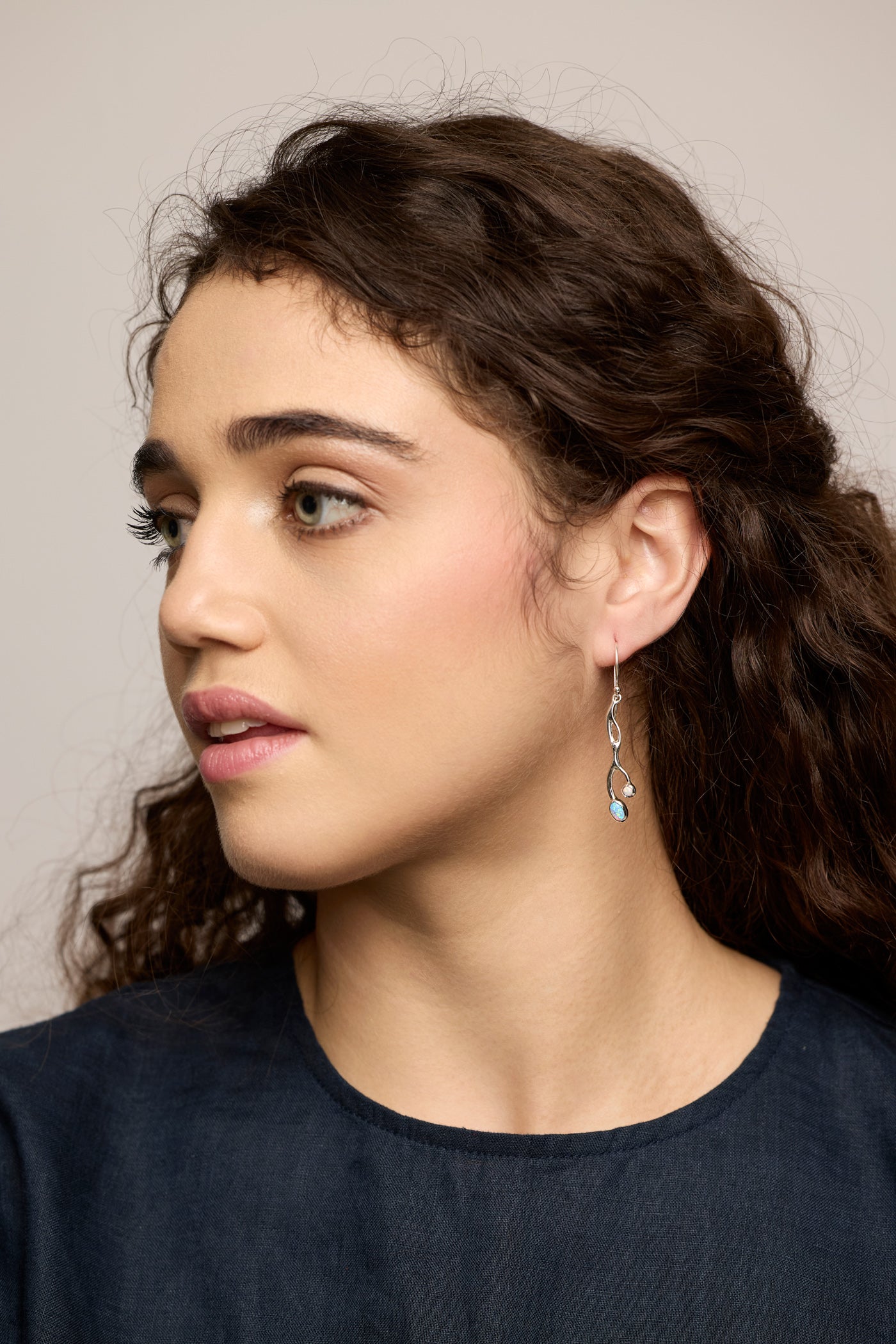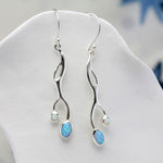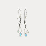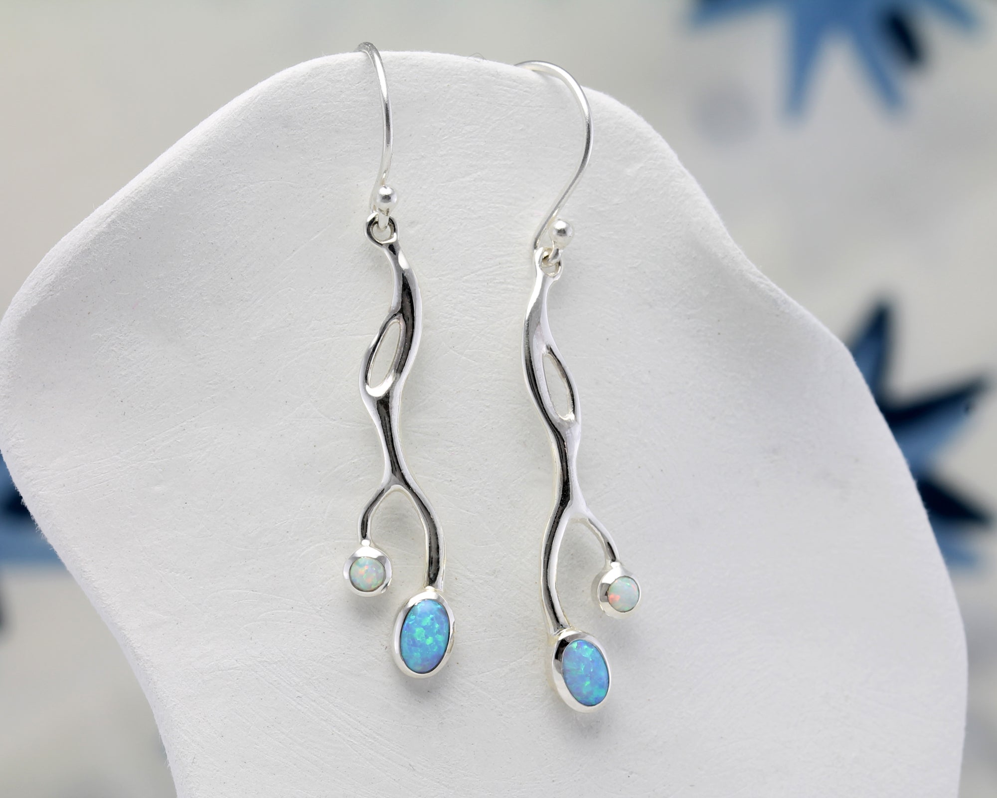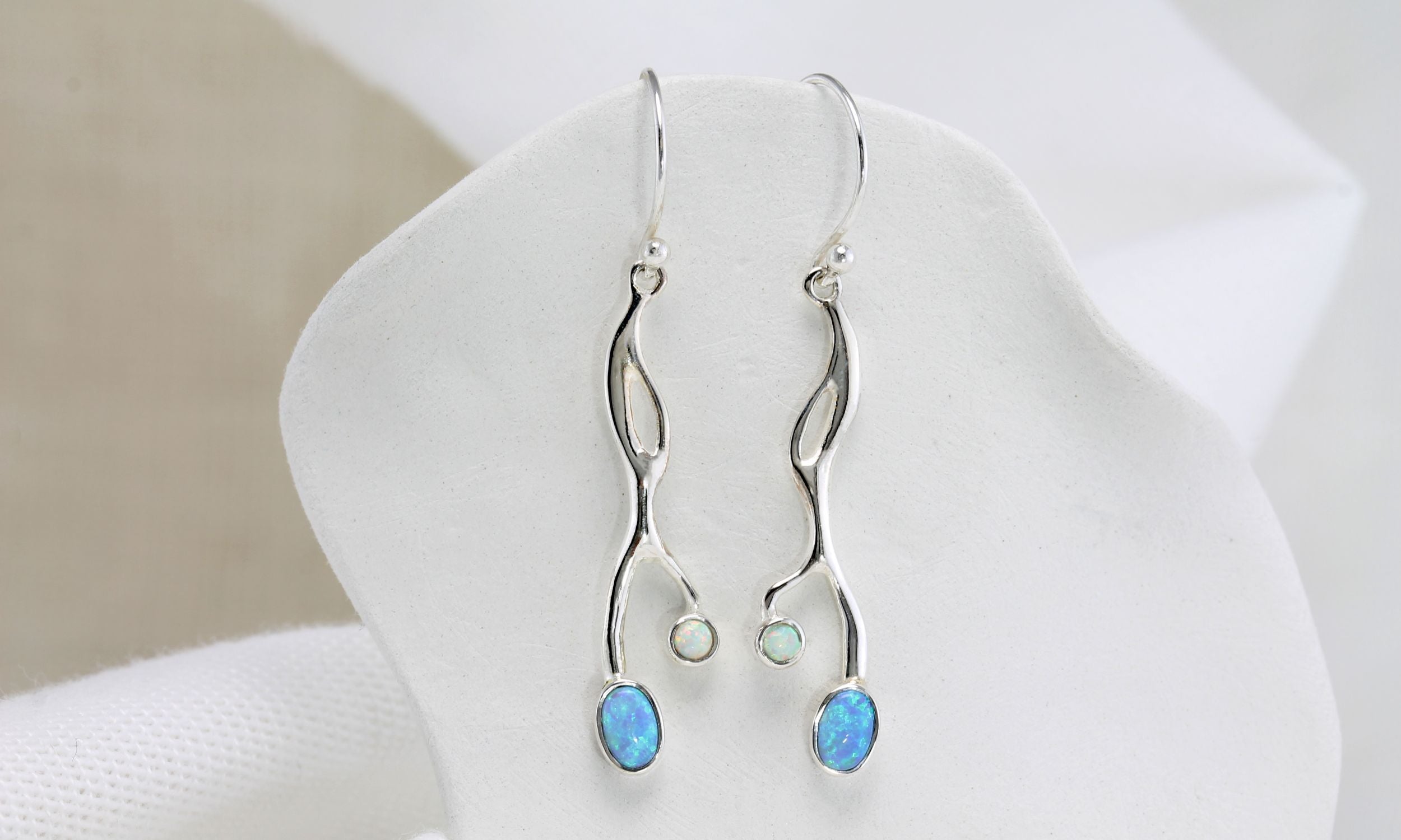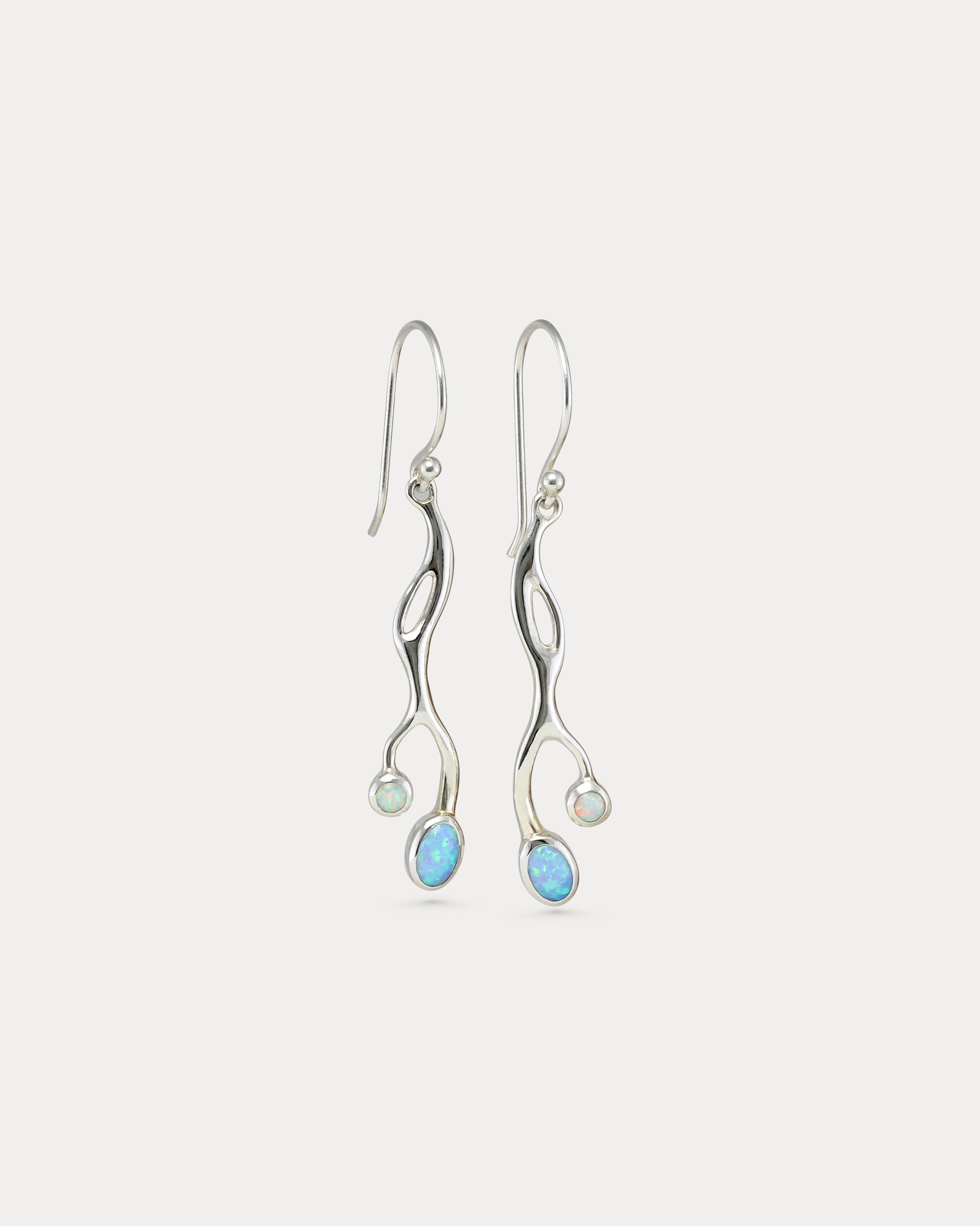 In a contemporary style, these earrings branch into flowing curves that beautifully showcase the vibrancy of the blue and white opalites.
