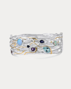 A truly unique statement necklace. Each gemstone is carefully curated, featuring blue Topaz, Iolite and purple Amethyst, expertly set on this handcrafted Sterling Silver necklace.