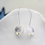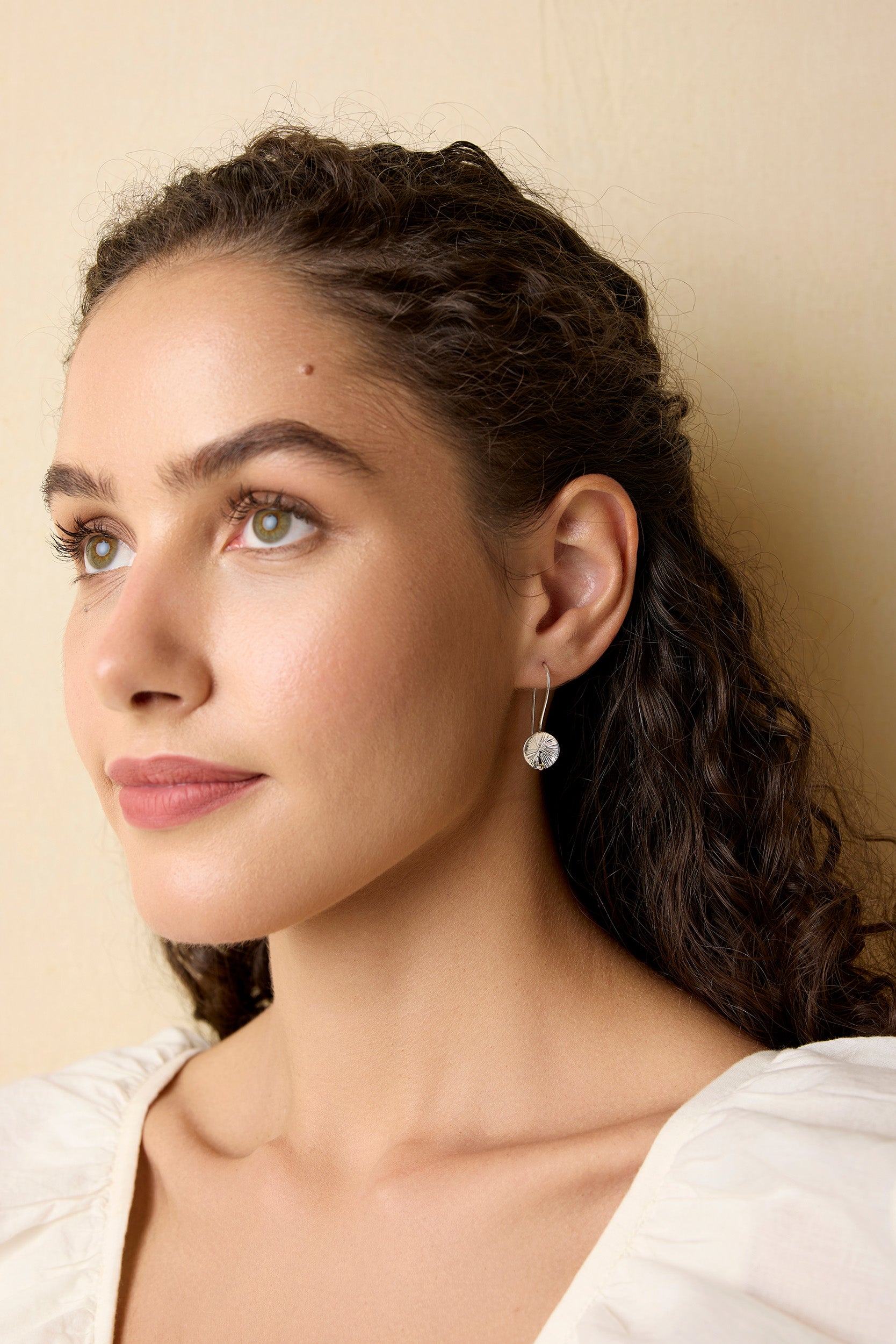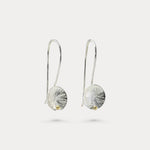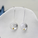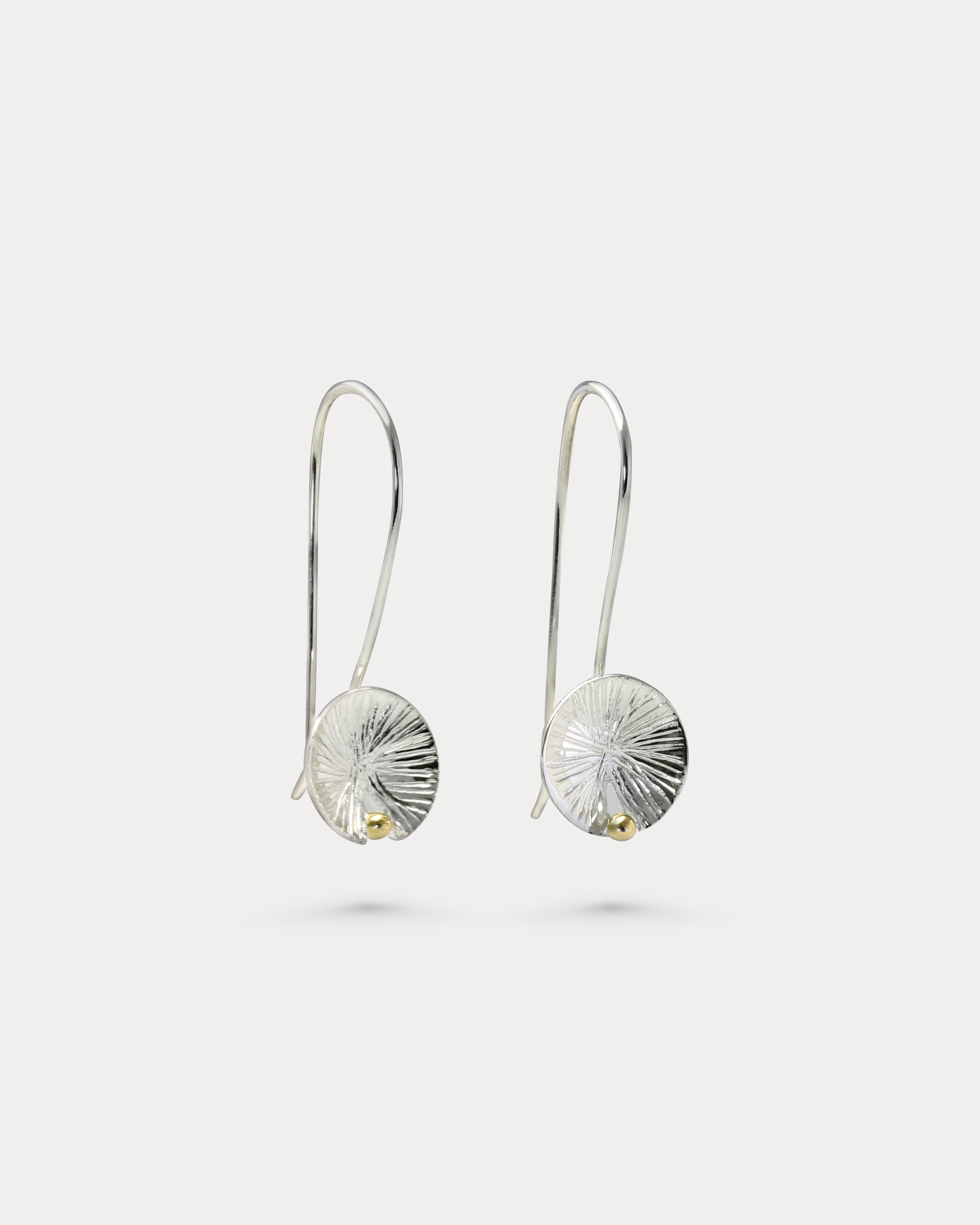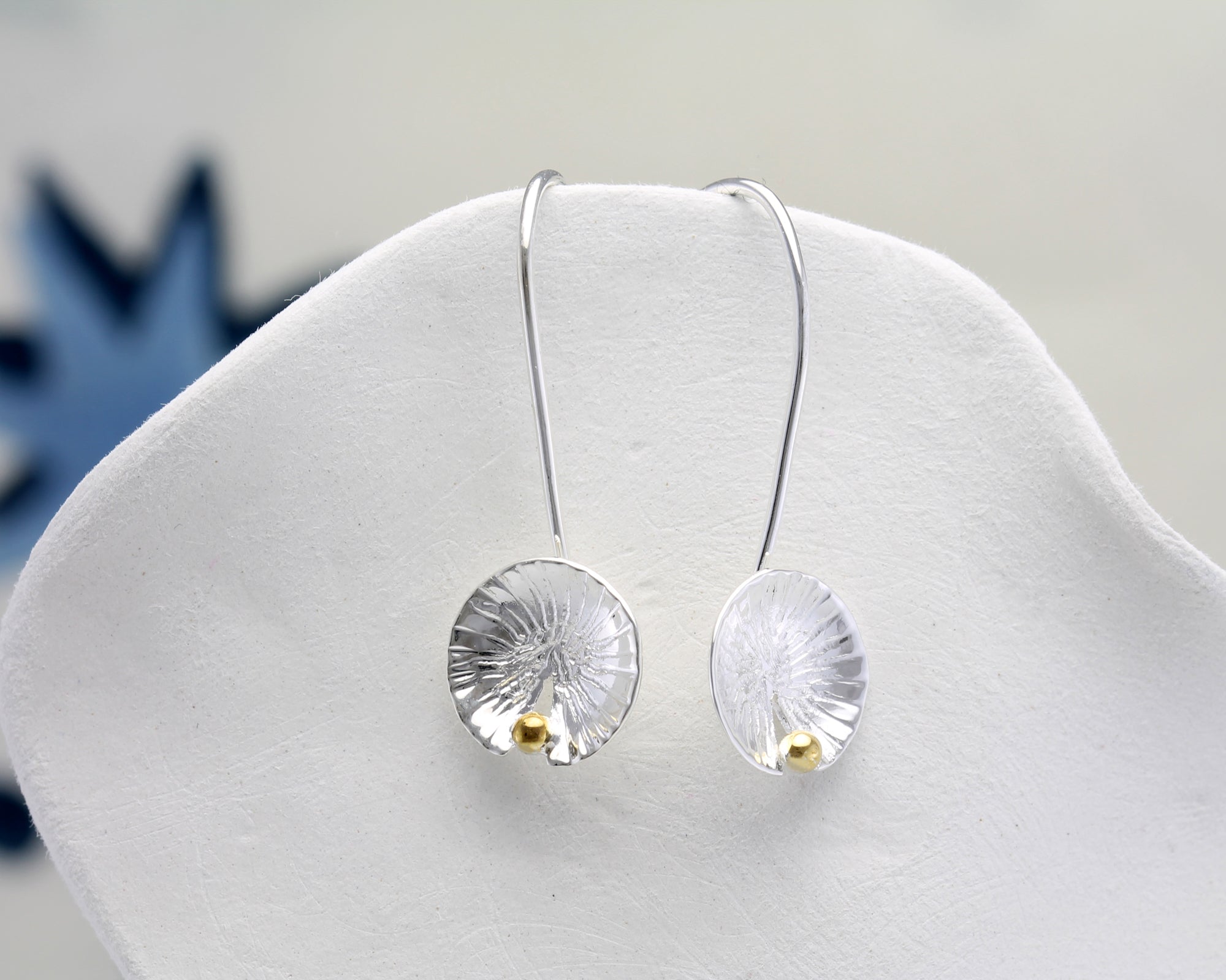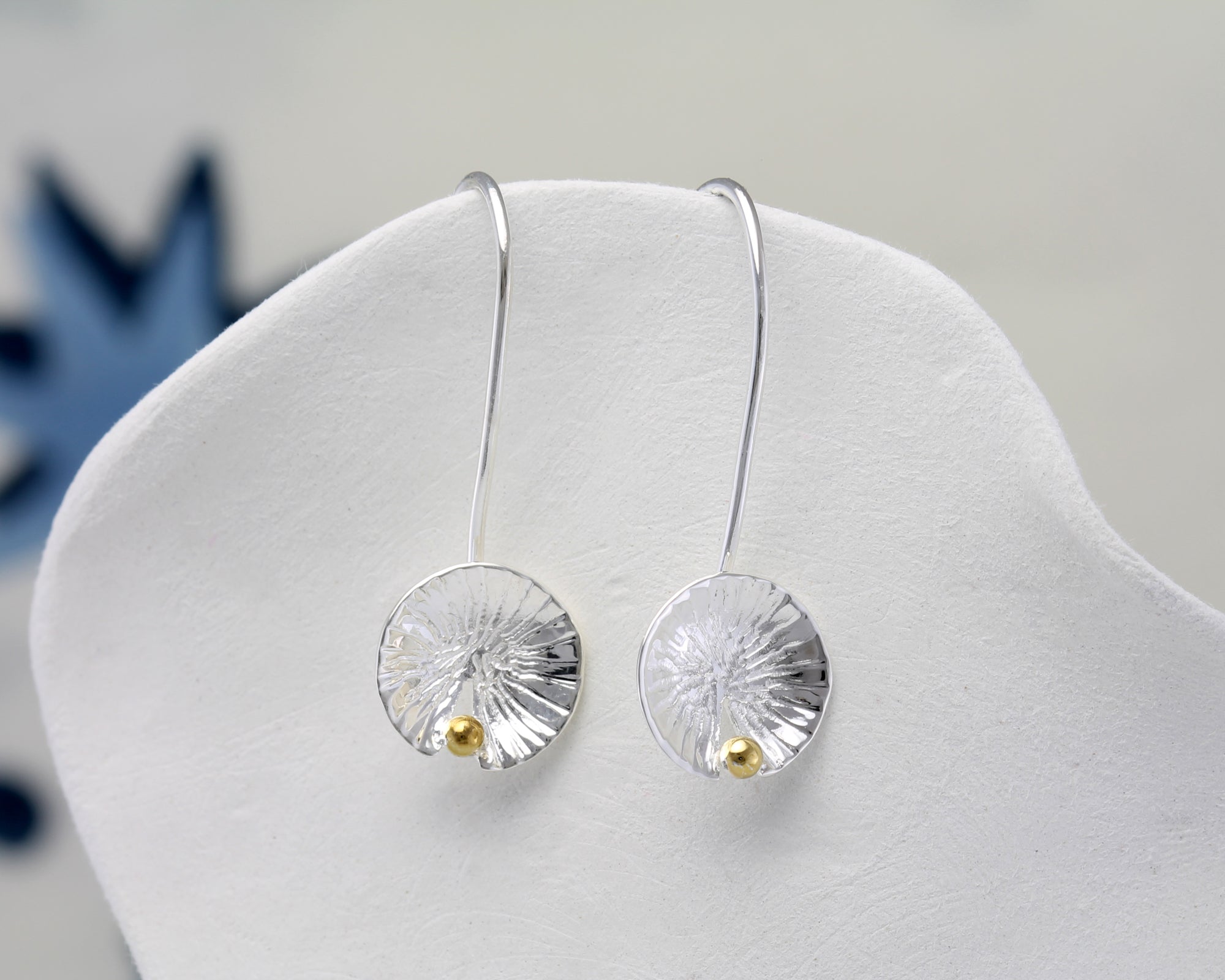 These dainty Sterling Silver drop earrings feature intricate lily-pad designs, complete with a dainty gold pip. The circle of Silver is beautifully textured and set on a slim hook back, making these the perfect pair to add a touch of elegance to any attire.