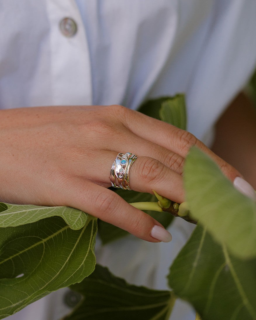 This statement ring showcases an array of vibrant blue and white fire Opalites. Handcrafted in a wave of Sterling Silver, it is finished with flowing 14KT Gold details. This piece was crafted from our unique wax form, combining Silver with striking Opals this gemstone ring adds an elegant touch of colour to any outfit.