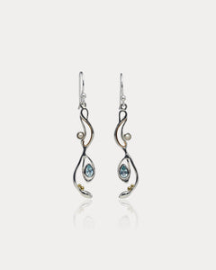 This hand-made dainty ring is set with a teardrop-shaped Blue Topaz and a Freshwater Pearl. Expertly crafted with Sterling Silver, the band is also enhanced with 14KT Gold detailing.