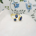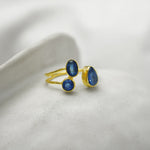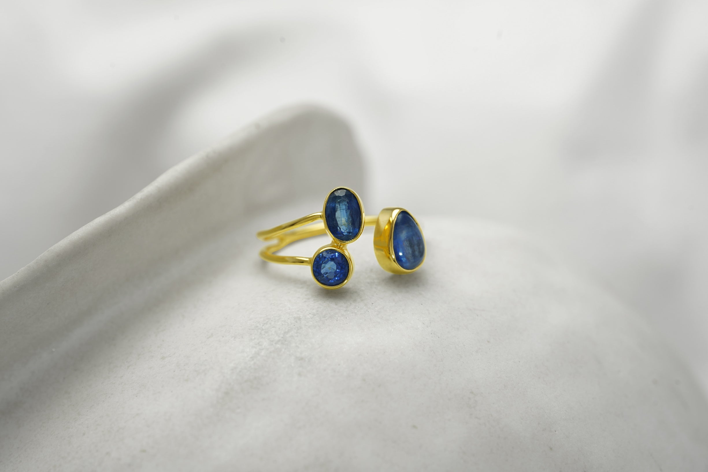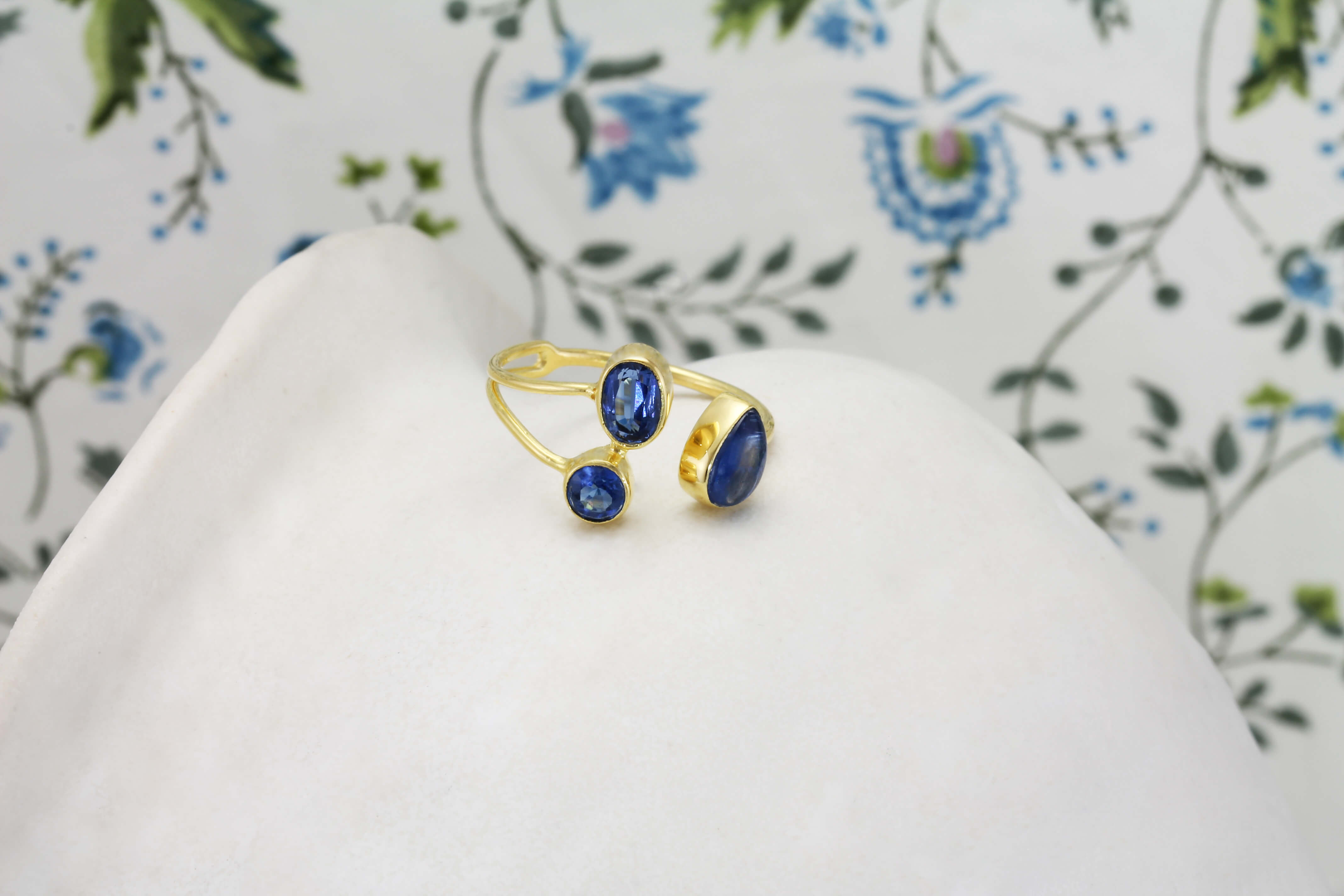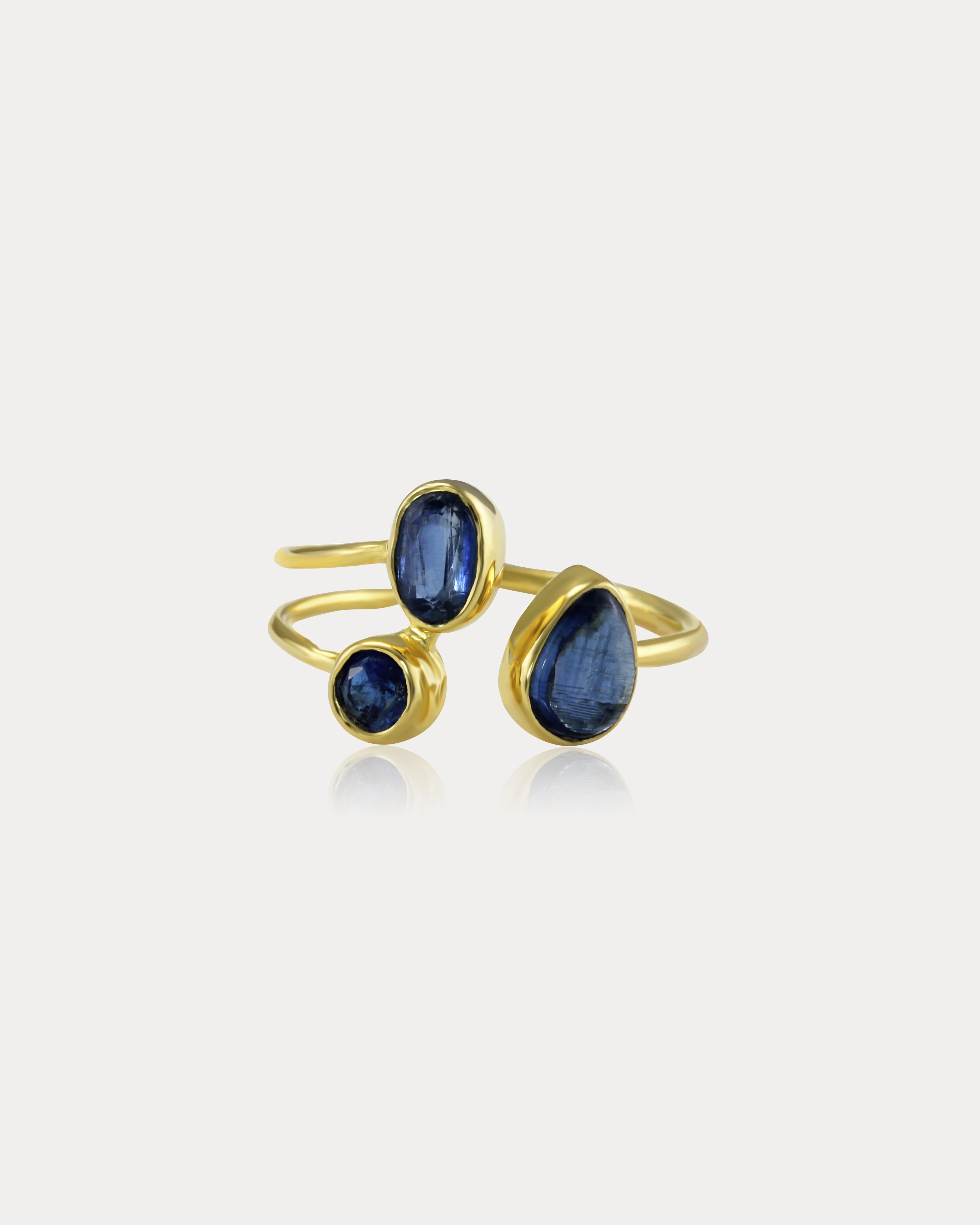 This Trinity of Kyanites Gold Ring is sure to turn heads. Round, oval, and teardrop Kyanite gemstones are set in a beautifully handcrafted 18KT Gold Vermeil ring.