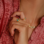 This Gold Vermeil ring was crafted using our traditional wax technique to create it's unique design. Complimented with three beautiful blue American Turquoise gemstones, this piece is eye-catching and makes a statement.