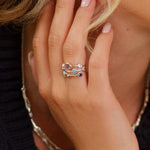 This multi-stone ring is crafted into three Sterling Silver strands, which are set with a cluster of gemstones; Amethyst, Blue Topaz, Peridot, Iolite, Cubic Zirconia, and white and blue fire Opals. The mix of stones combined with this design offers a sophisticated yet unique look.