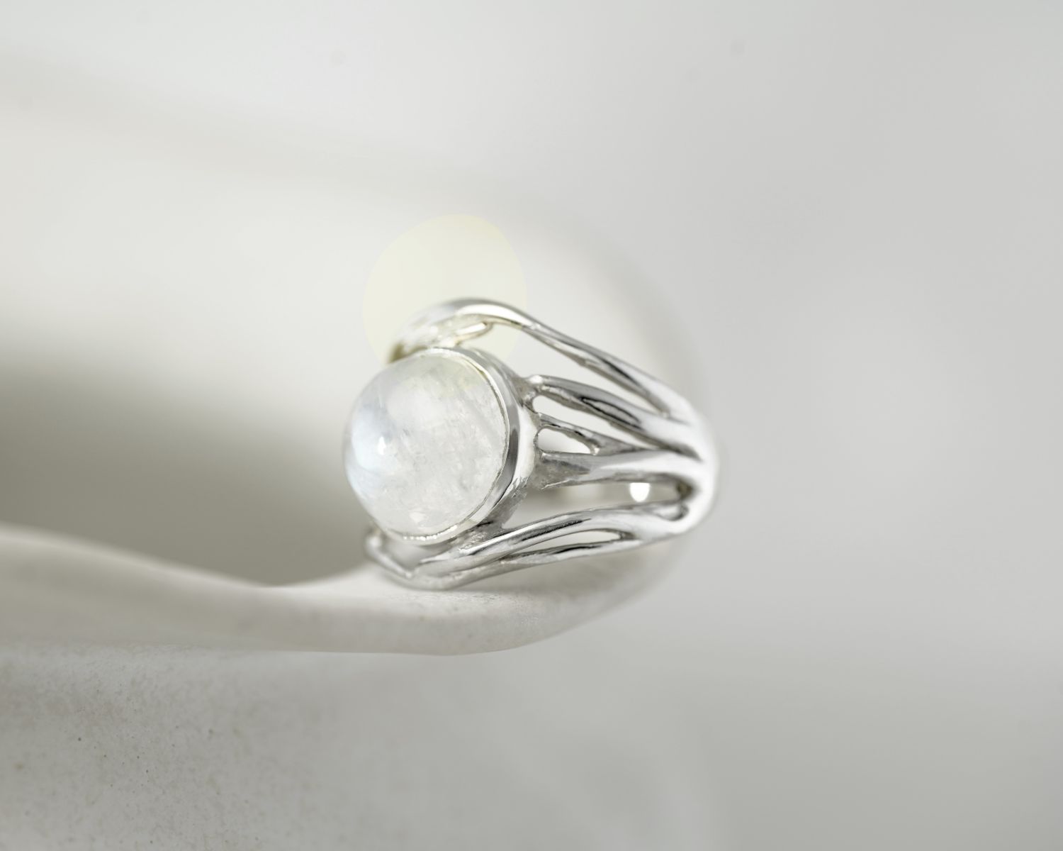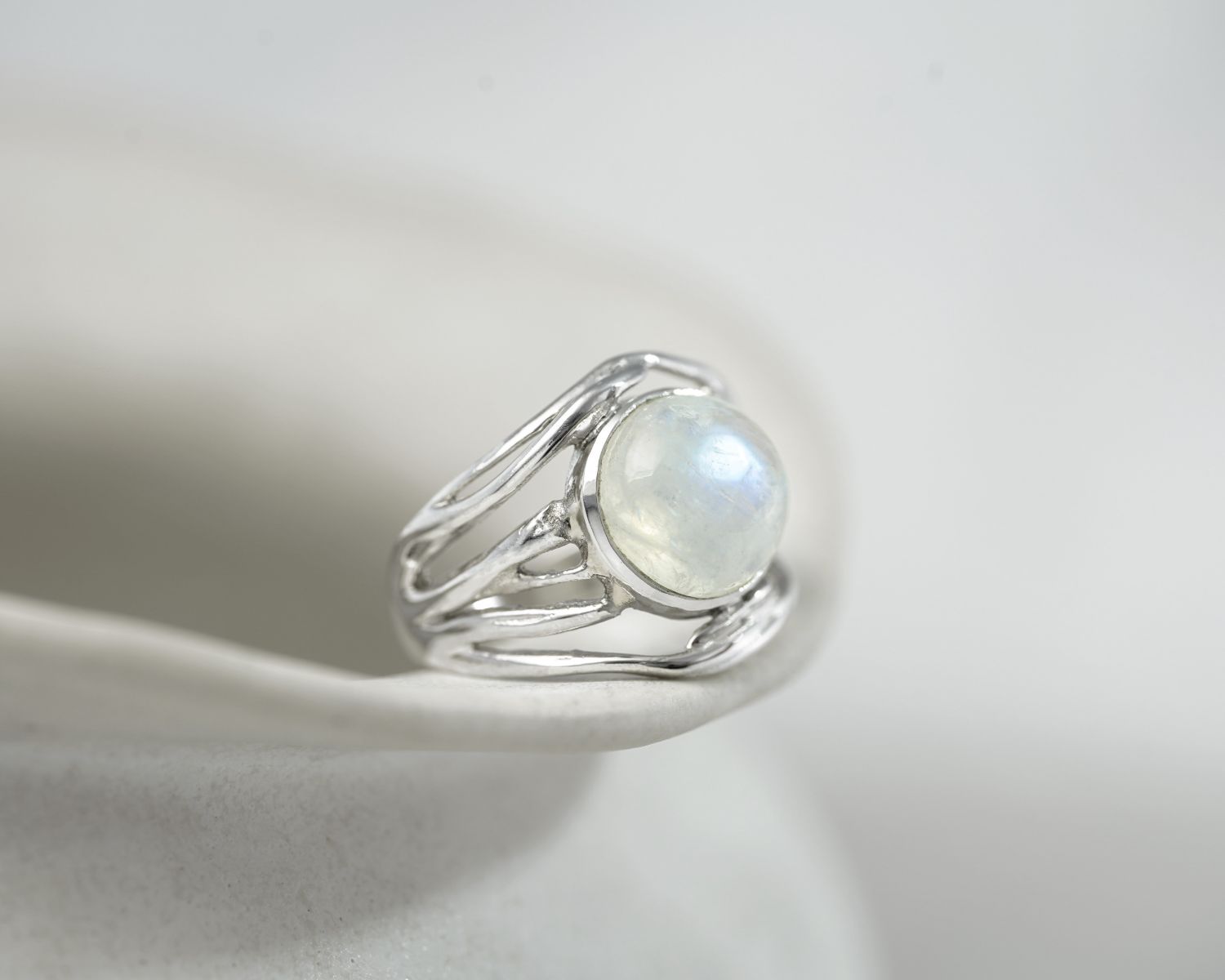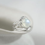 This flowing Sterling Silver ring boasts a beautiful, large Rainbow Moonstone on organically formed curves of Silver. This radiant gemstone catches the light in an array of turquoise hues, a truly unique statement piece sure to catch everyone's eye.