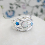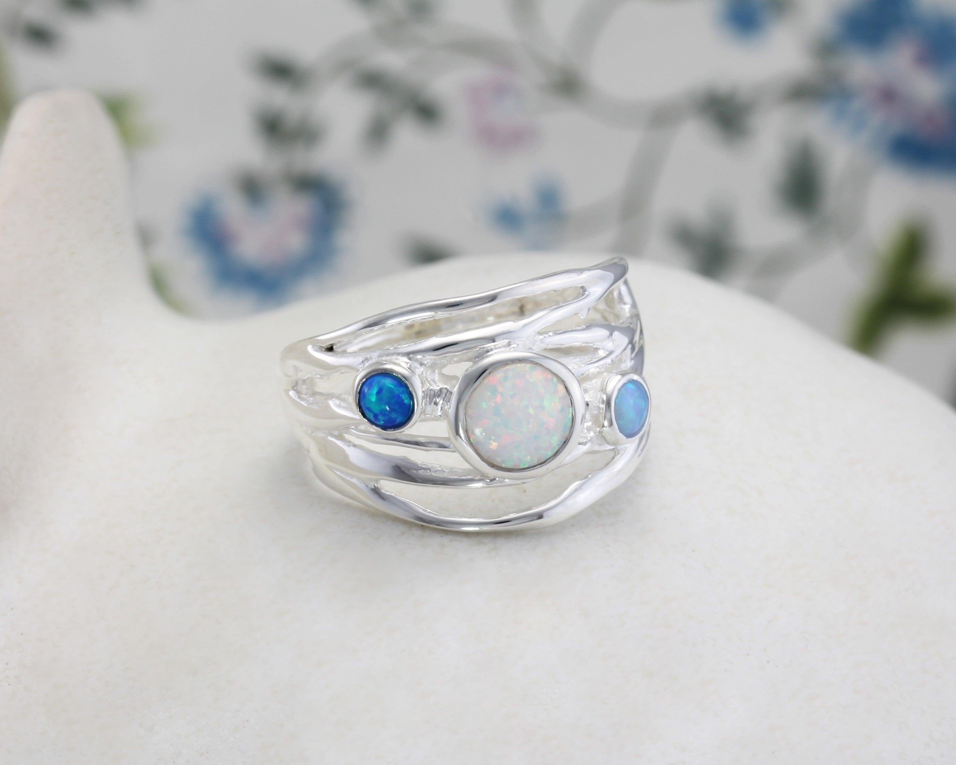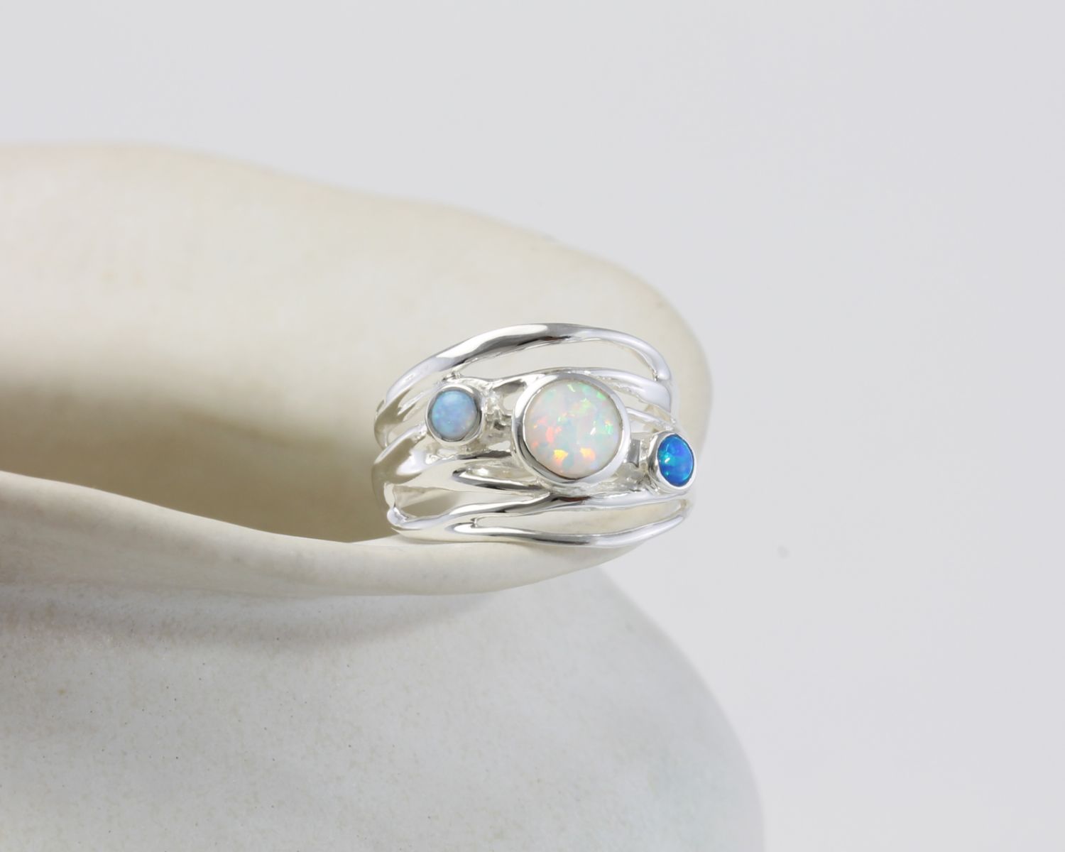 An eye-catching Sterling Silver statement ring set with a trio of Opals. Two brilliant blue fire Opals are set on either side of a large vibrant white fire Opal. The piece features flowing silver crafted from our unique wax form.