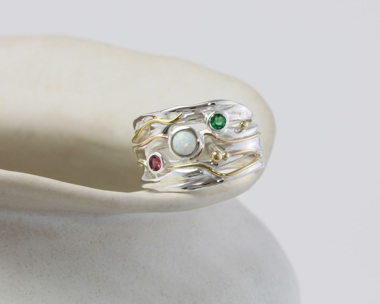 This statement ring is handcrafted from flowing Sterling Silver, and features a dainty Emerald and Pink Tourmaline, paired with a mesmerising central White Fire Opal. The uniquely curving design and 14KT Gold details make this piece a true statement of elegance and sophistication.